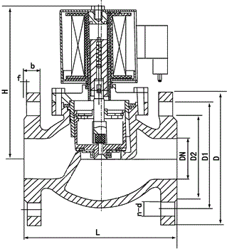 本閥為分步動作直接先導(dǎo)式電磁閥,可根據(jù)斷電時所處開、關(guān)狀態(tài)的不同,可分為常閉式電磁閥和常開式電磁閥。常閉電磁閥,線圈通電后,銜鐵在電磁力作用下先帶動副閥閥塞提起,主閥閥杯上的流體經(jīng)副閥流走,減少了作用在主閥閥杯上的壓力,當(dāng)主閥閥杯上的壓力減少到一定值時,銜鐵帶動主閥閥杯,并利用壓差而使主閥閥杯開啟,介質(zhì)流通。線圈斷電后,電磁力消失,銜鐵因自重下落復(fù)位。同時依靠介質(zhì)壓力,主副閥得以緊密關(guān)閉。常開電磁閥,線圈通電后由于吸力作用,動鐵芯下移,把副閥閥塞壓下,副閥關(guān)閉,主閥閥杯內(nèi)壓力上升,當(dāng)壓力升到一定值時,主閥閥杯的上下壓差一樣,由于電磁力作用,動鐵芯推動主閥閥杯下,壓緊主閥閥座,閥門關(guān)閉。線圈斷電時,電磁吸力為零,副閥閥塞和動鐵芯由于彈簧作用向上提起,副閥打開,主閥閥杯上的流體經(jīng)副閥流走,減少了作用在主閥閥杯上的壓力,當(dāng)主閥閥杯上的壓力減少到一定值時,利用壓差把主閥閥杯推起,主閥打開,介質(zhì)流通
