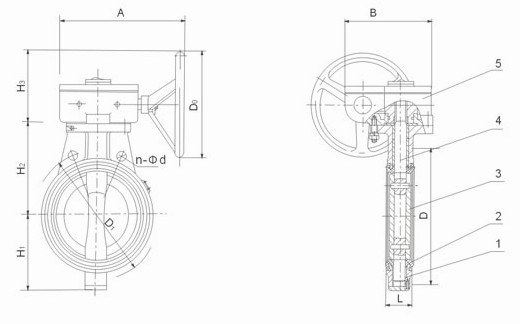 部件列表:1、閥體 2、閥座 3、蝶板 4、閥桿 5、蝸輪裝置