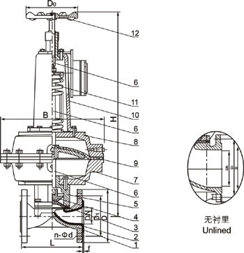 Parts List: 1, Body 2, Body Lining 3, Diaphragm 4, Disc 5, Lower Stem 6, Cover 7, Cylinder 8, Piston 9, Spring 10, Cylinder Head 11, Upper Stem 12, Handwheel