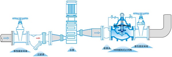 The 300X slow-closing check valve consists of main valve, one-way valve, needle valve, ball valve, micro-filter and pressure gauge. Using hydraulic automatic operation, the main valve can get the best opening or closing speed. To prevent the water hammer from hitting, we can achieve the effect of slow closing and silencing.