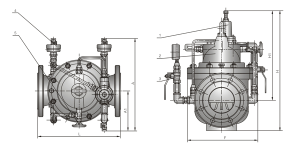 1, pilot valve 2, main valve 3, ball valve 4, pressure gauge 5, needle valve.